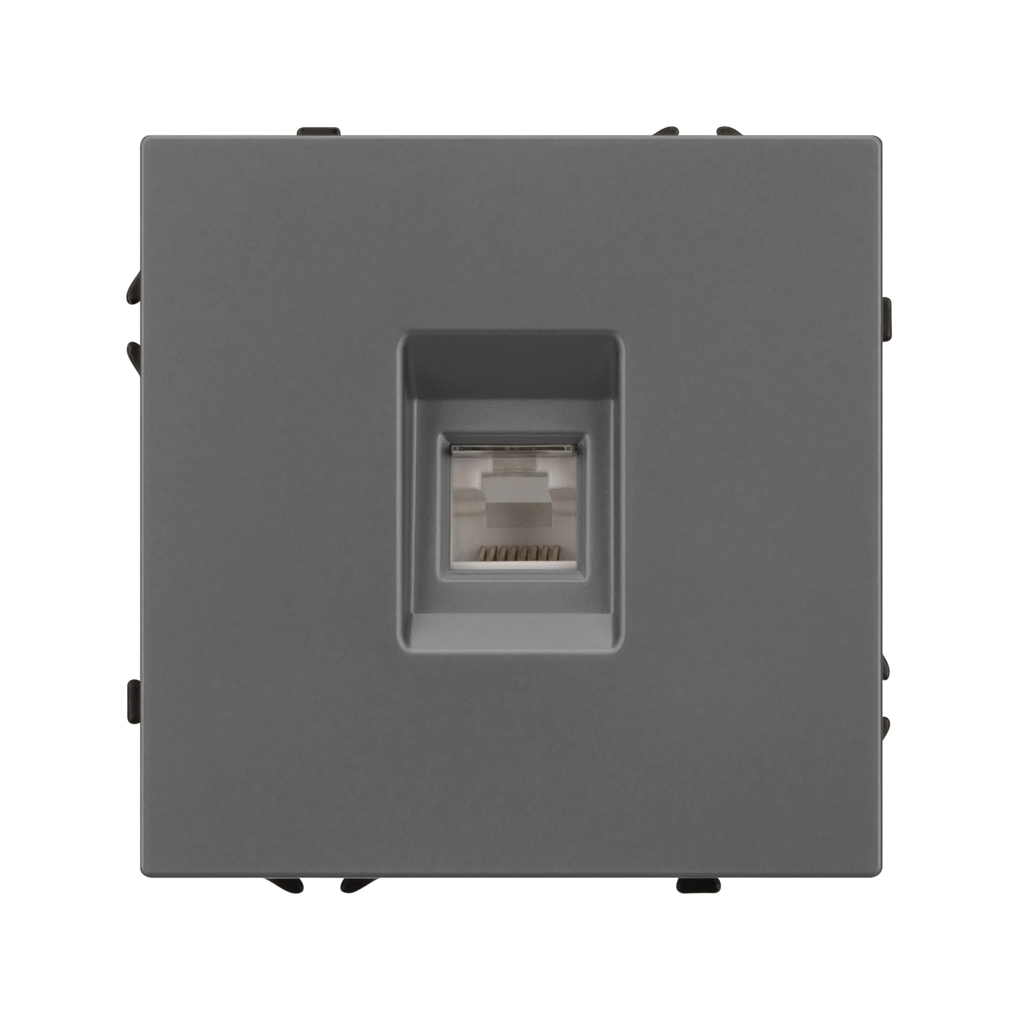 Механизм компьютерной розетки на 1 пост 6-й категории. Цвет - серый базальт, с Soft-Touch покрытием. Без фронтальной рамки. Уровень пылевлагозащиты IP20. Тип подключаемого разъема - RJ45. Розетка устанавливается в стандартный подрозетник круглого сечения диаметром 60мм.