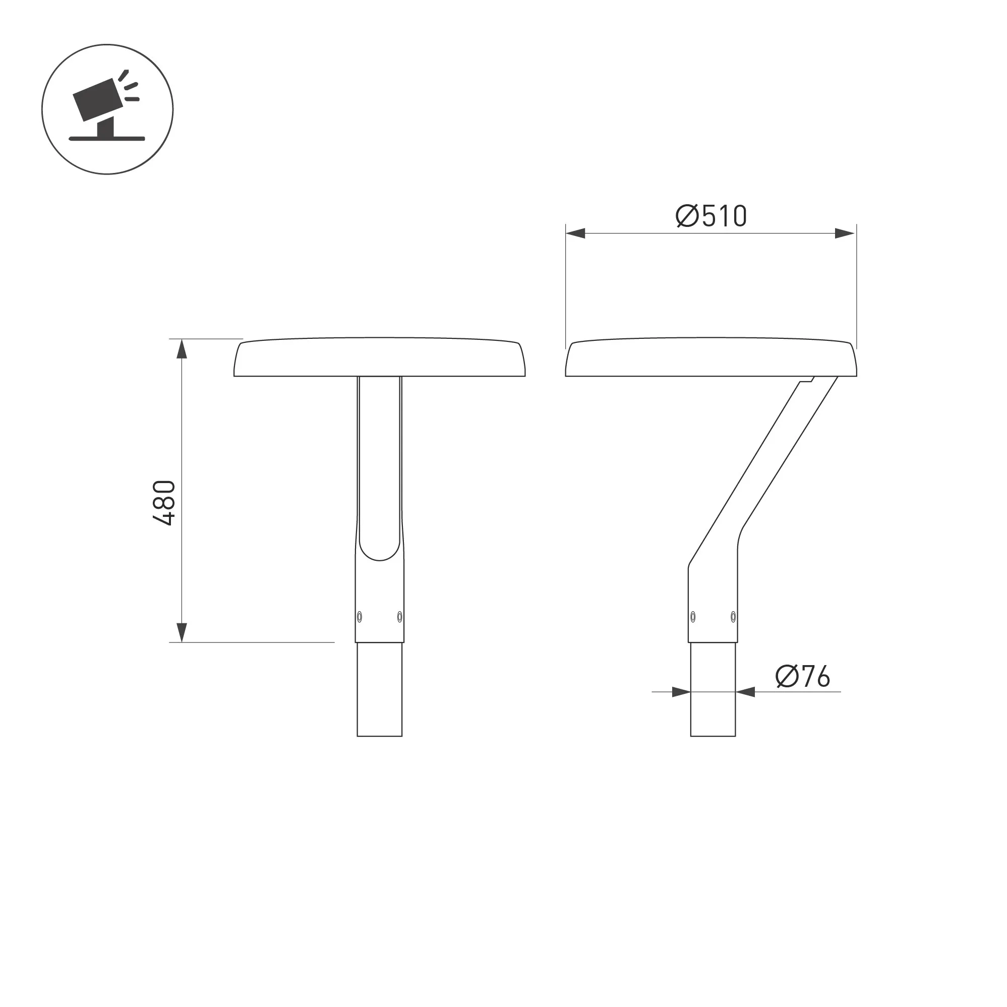 Поставка под заказ от 5 шт. Венчающий светодиодный светильник. Мощность 50 Вт, св. поток 7100 лм, 141 лм/Вт, тёплый 3000 K, CRI>80, угол 145x40°, напряжение питания 230 В. Черный корпус из алюминия, экран закаленное стекло, степень защиты IP65. Размер: диаметр 510 мм, высота 480 мм. Монтаж на вертикальную опору диаметром 76 мм.