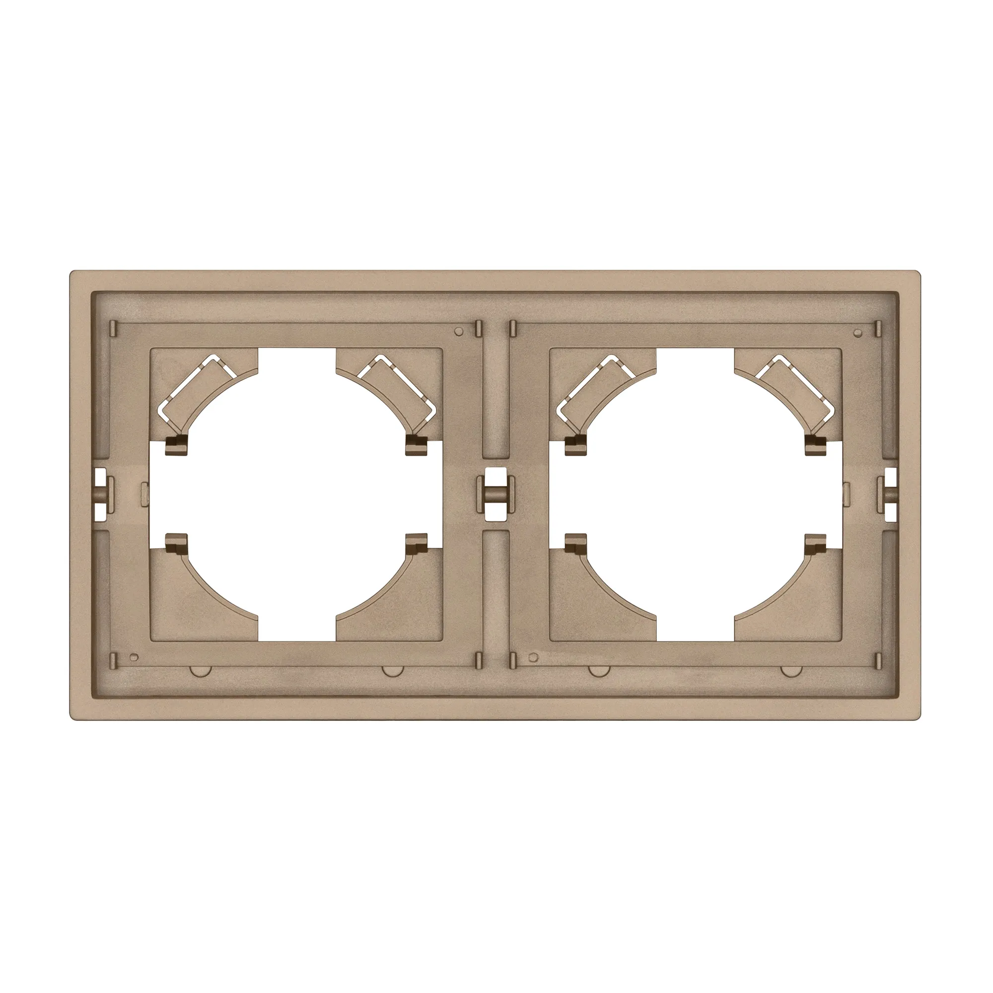 Рамка пластиковая на 2 поста, под встраиваемый механизм. Цвет - песочный. Уровень герметичности IP20. Ориентация монтажа горизонтальная. Габаритные размеры: длина 150 мм, ширина 80 мм, высота 9 мм. Гарантийный срок 12 мес.