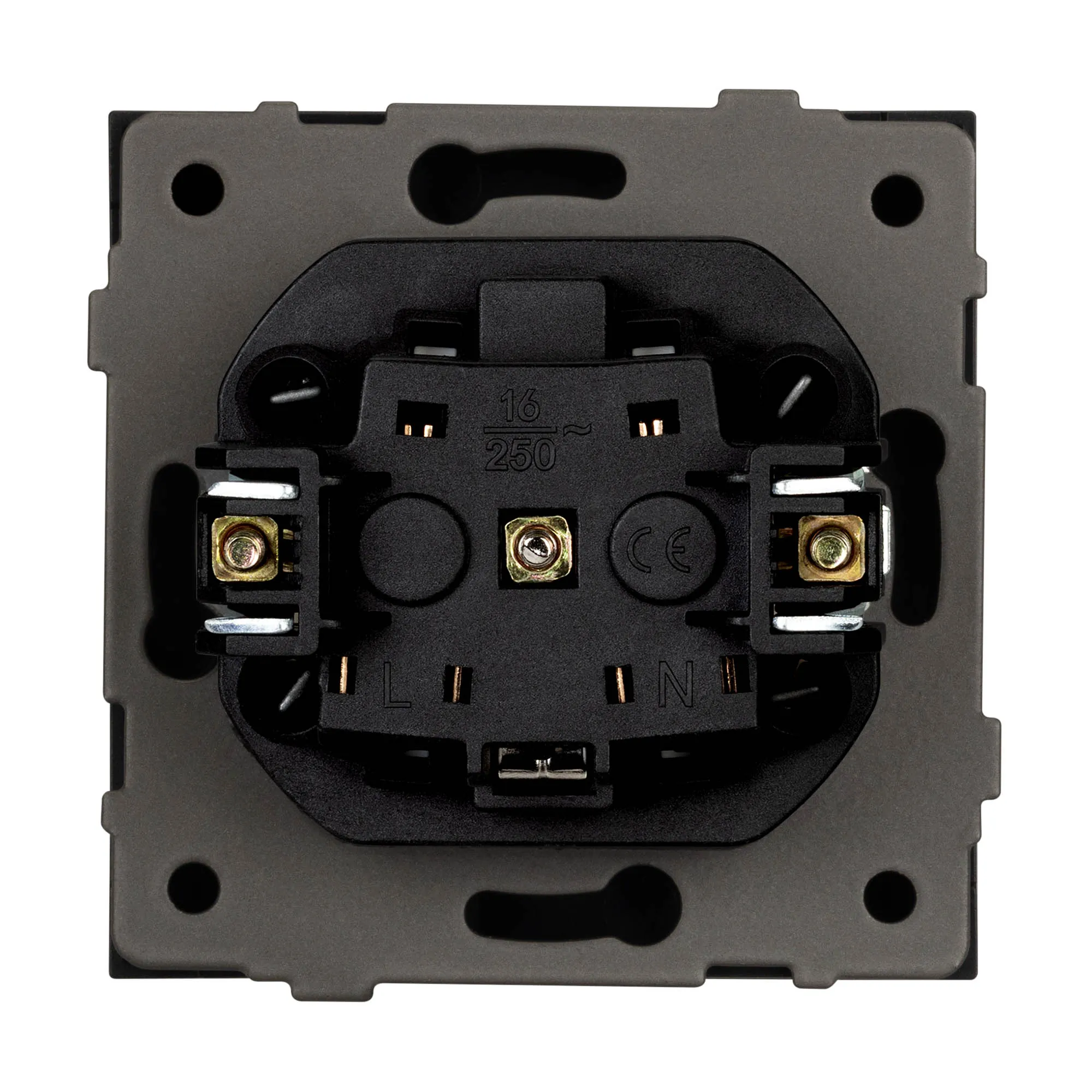 Механизм розетки с заземлением на 1 пост. Цвет - черный. Без фронтальной рамки. Уровень пылевлагозащиты IP20. Розетка устанавливается в стандартный подрозетник круглого сечения диаметром 60мм.