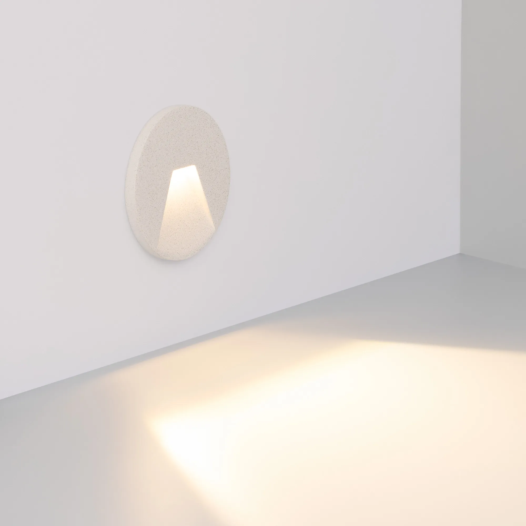 Светодиодный встраиваемый круглый светильник для стен, лестниц. Мощность 3Вт, световой поток 80 лм, теплый 3000К, угол 75x30°, CRI>80, напряжение 230 В. Круглый корпус из бетона белого цвета и алюминия. Степень защиты IP65. Питание AC230V, мощность 3Вт. Размеры DxH 120x76мм. Драйвер встроенный, пульсация <0.5%.