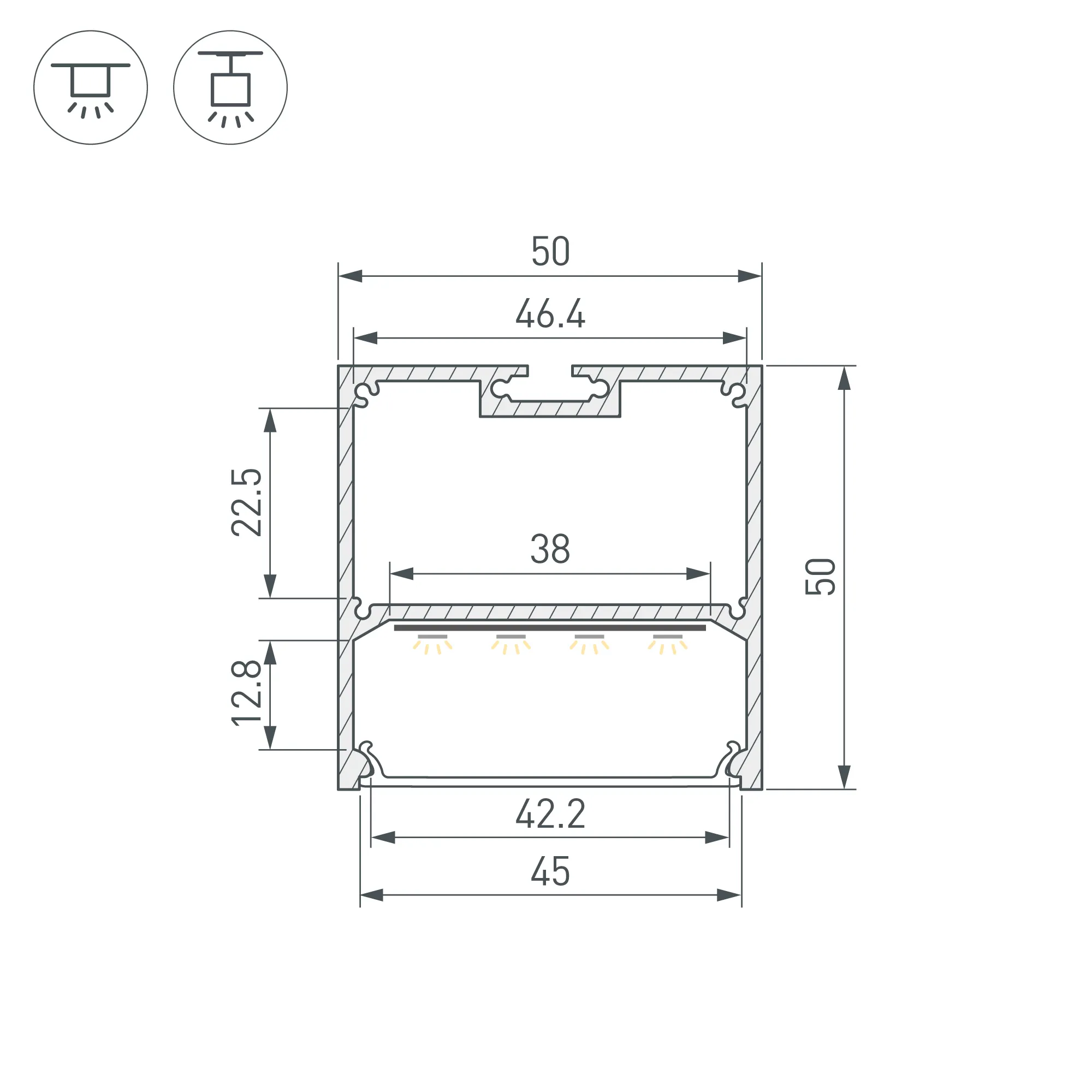 Алюминиевый анодированный профиль для светодиодных лент и линеек. Габаритные размеры (L×W×H): 2000x50x50 мм. Ширина площадки для ленты 38 мм. Отсек для БП 46,4х22,5мм. Экраны, заглушки и другие аксессуары приобретаются отдельно. Цена за 1 метр.